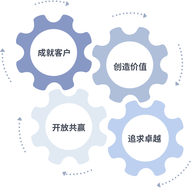成就客户是一切决策的出发点,,,,创造价值是衡量所有工作的标准,,,追求卓越是55世纪做事做人的态度,,,,开放共赢是55世纪的格局也是最终的结果。。。。价值观的齿轮环环相扣,,推动着组织里的每个人不断向前。。